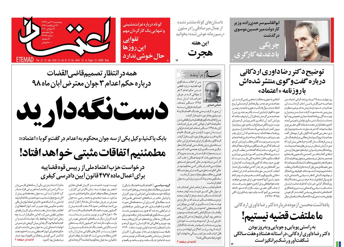 📌صفحه اول #روزنامه_اعتماد، پنجشنبه ۲۶ تیرماه ۱۳۹۹#اعدام #آبان_98 pic.twitter.com/Iuay0YuN27