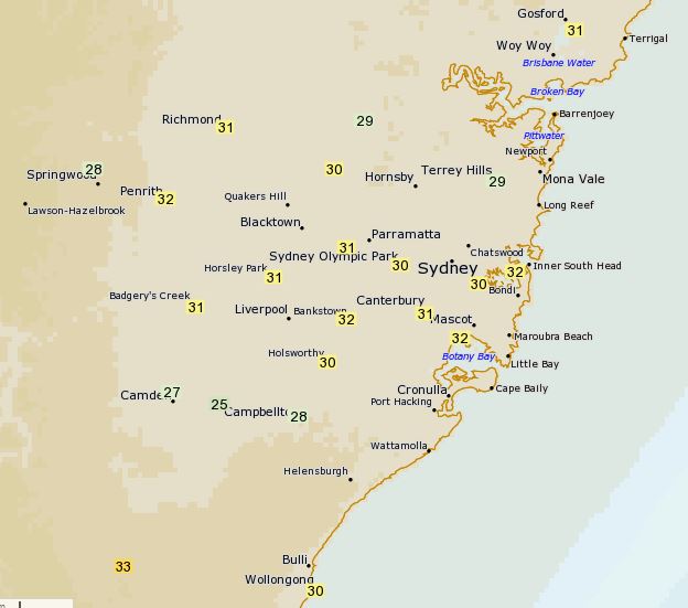 By 2.30pm on Sunday, central Sydney had hit 39.5C as north-westerly winds held back the sea breeze, while Penrith reached 38.1C and Parramatta 40.3C.