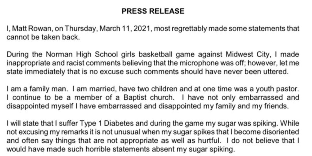 “Last night during the Norman High School girls’ basketball game versus Midwest City in the Oklahoma 6A State Basketball Tournament, National Federation of High School (NFHS) Network announcers on a live stream broadcast made racist and hateful comments targeted at our Norman High student athletes. The announcers were contracted by OSSAA for the state tournament.
